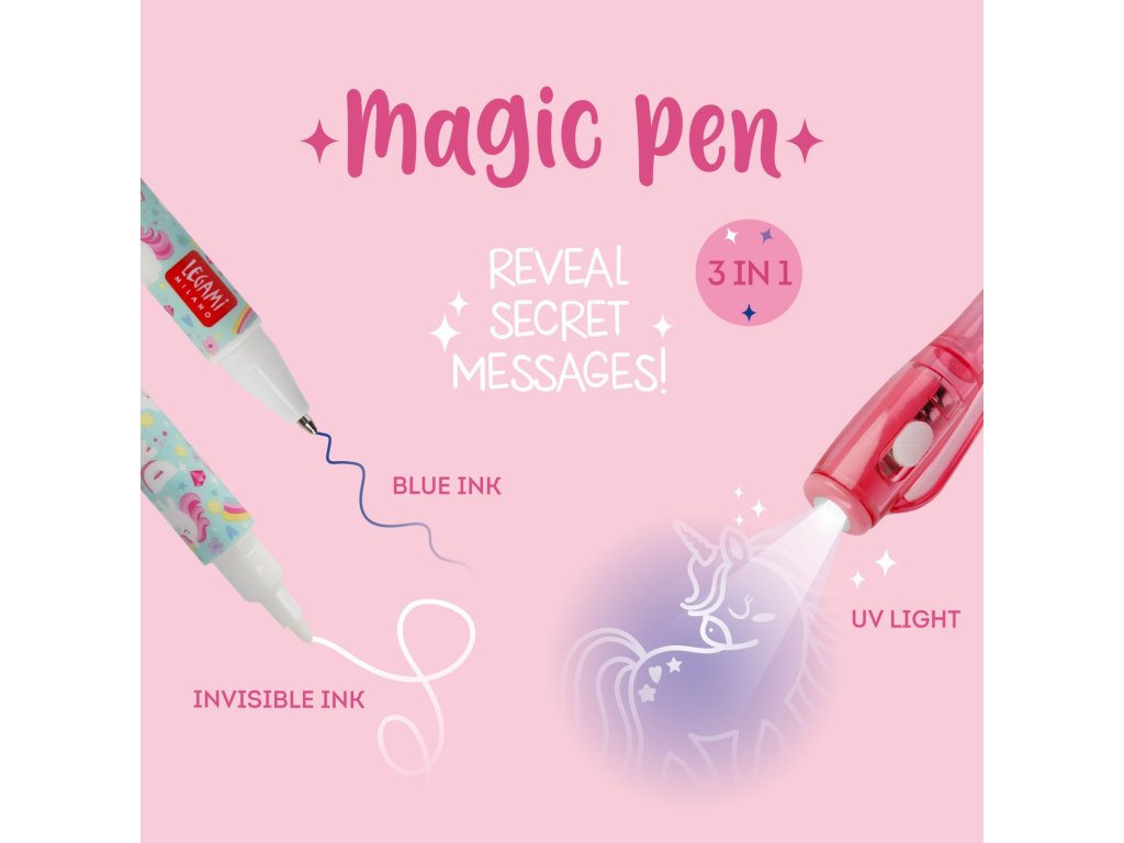 Der unsichtbare Stift Legami Invisible Ink Pen Magic Pen Unicorn ist ideal für alle kleinen Geheimniskrämer. Was Sie schreiben, bleibt verborgen, bis Sie den Text mit einer speziellen Lampe am Ende des Stifts beleuchten. Und dann wird Ihr Geheimnis auf magische Weise enthüllt.